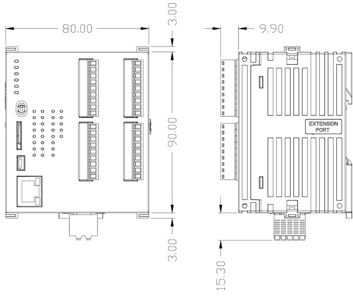 | 内置 | 24VDC 电源供应 CPU 模块,Ethernet 通讯口 x 1 、RS-485 通讯口 x 2、USB 通讯口 x 1、CAN 通讯口 x 1、Micro SD 卡接口,以及 28 点 I/O,采用脱落式端子 |